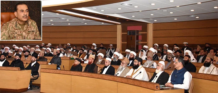 پاک فوج کے شعبہ تعلقات عامہ آئی ایس پی آر کے مطابق علمائے کرام و مشائخ سے ملاقات کے دوران آرمی چیف نے کہا کہ بغیر کسی مذہبی، صوبائی یا کسی اور امتیاز کے پاکستان تمام پاکستانیوں کا ہے۔آئی ایس پی آر کا کہنا ہے کہ علمائے کرام و مشائخ نے متفقہ طور پر انتہا پسندی، دہشت گردی اور فرقہ واریت کی مذمت کی، علمائے کرام و مشائخ نے ملک میں رواداری، امن کی ریاستی کوششوں کیلئے بھرپور حمایت جاری رکھنے کا عزم کیا۔علمائے کرام و مشائخ نے سیکیورٹی فورسز کی انتھک کوششوں کیلئے اپنی بھرپور حمایت جاری رکھنے کا بھی عزم کیا۔آئی ایس پی آر کے مطابق علمائے کرام و مشائخ نے کہا کہ اسلام امن اور ہم آہنگی کا مذہب ہے، بعض عناصر کی مذہب کی مسخ شدہ تشریحات صرف ان کے ذاتی مفادات کیلئے ہیں، بعض عناصر کی مسخ شدہ تشریحات کا اسلامی تعلیمات سے کوئی تعلق نہیں۔آرمی چیف نے انتہا پسندوں، دہشت گردوں کے گمراہ کن پروپیگنڈے کے خاتمے کیلئے علماء کے فتویٰ ”پیغام پاکستان“ کو سراہتے ہوئے علماء و مشائخ سے گمراہ کن پروپیگنڈے کی تشہیر کے تدارک پر زور دیا۔آئی ایس پی آر کے مطابق آرمی چیف نے گمراہ کن پروپیگنڈے کے تدارک اور اندرونی اختلافات کو دور کرنے پر زور دیتے ہوئے قرآن و سنت کی تفہیم اور کردار سازی کیلئے نوجوانوں کو راغب کرنے میں علماء کے کردار کی نشاندہی بھی کی۔پاک فوج کے شعبہ تعلقات عامہ کے مطابق فورم نے متفقہ طور پر غیر قانونی مقیم غیر ملکیوں کی وطن واپسی کی حمایت کی، فورم نے حکومت پاکستان کے ایک دستاویزی نظام (پاسپورٹ) کے نفاذ کی حمایت کی، فورم نے انسداد اسمگلنگ، ذخیرہ اندوزی اور بجلی چوری کے خلاف اقدامات کی حمایت کی۔