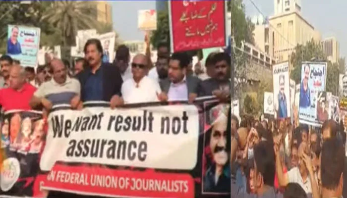 صحافی جان محمد مہر کے قاتلوں کی عدم گرفتاری کے خلاف کراچی میں صحافتی تنظیموں نے احتجاجی ریلی نکالی جس کے شرکاء نے پی آئی ڈی سی سگنل پر دھرنا دے دیا۔