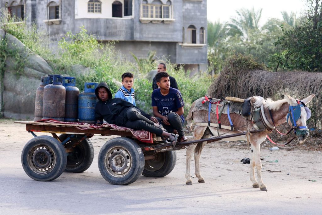 ہفتے کے روز، جنوبی غزہ میں رفح میں کھانا پکانے کی گیس سے بھرے خالی گیس کنستروں کو لے جانے کے لیے بچے گدھے سے کھینچی ہوئی گاڑی کا استعمال کر رہے ہیں [خطیب/اے ایف پی نے کہا