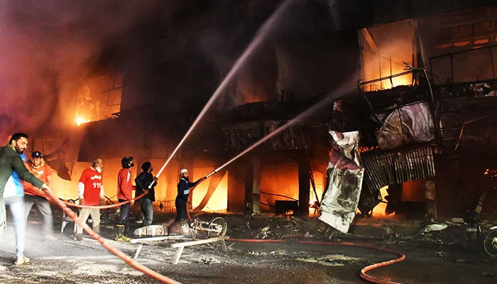 فائربریگیڈ حکام نے بتایا کہ آگ گلزار حجری میں بسم اللہ ٹاؤن کی دکانوں میں لگی۔